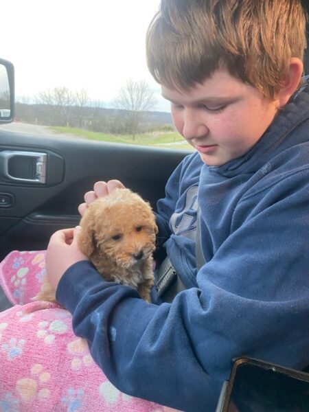 We’ve been looking for a new fur baby for awhile and I just so happened to come across Harmony View Puppies. I joined their FB page and saw a photo of Bucky (now Reece) on 12/31/24 and immediately sent it to my husband. A few hours later we are reserving our pup and we drove almost 4 hours to go get him the next day. He is so well behaved and sweet and did fantastic in the car! My kids are over the moon and I can’t wait to see them all grow up together. – Natalie A.
